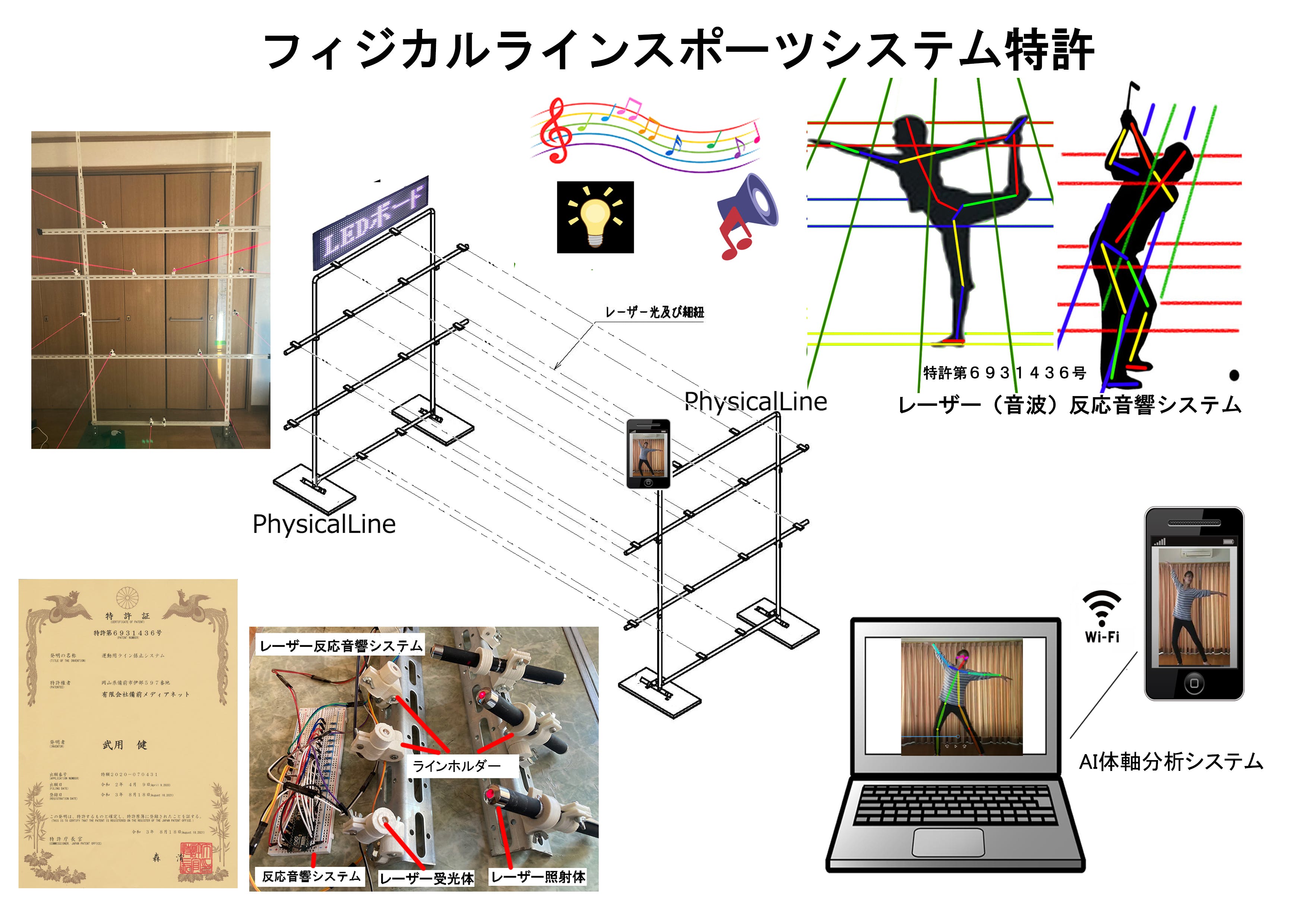 運動用ラインは、ゴム紐等の細い紐、ロープ等の太い紐やポール、さらには目に照射されても害のない光量のレーザー光線や音波を、 希望する高さや幅に複数張り巡らせ、姿勢や体軸が上下左右または前後に揺れて、ラインに触れた瞬間に、触れた感覚だけではなく、 音声や音楽、ライティングやモニターによる自我映像や電光掲示板で、瞬時に自分の体勢が判断することのできる運動器具システム特許です。 さらに携帯電話や通信システムにつながったカメラやスピーカーを使用し、遠隔授業や体軸・バランスの解析を行うことも可能です。